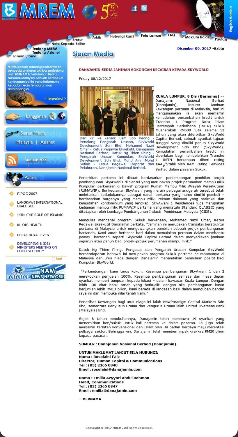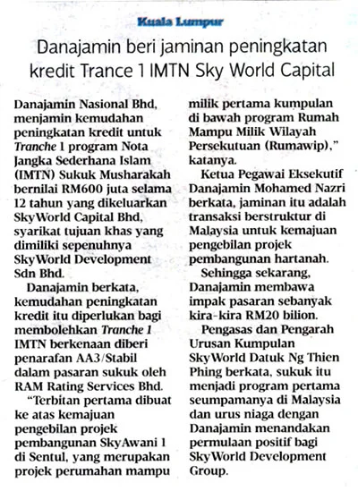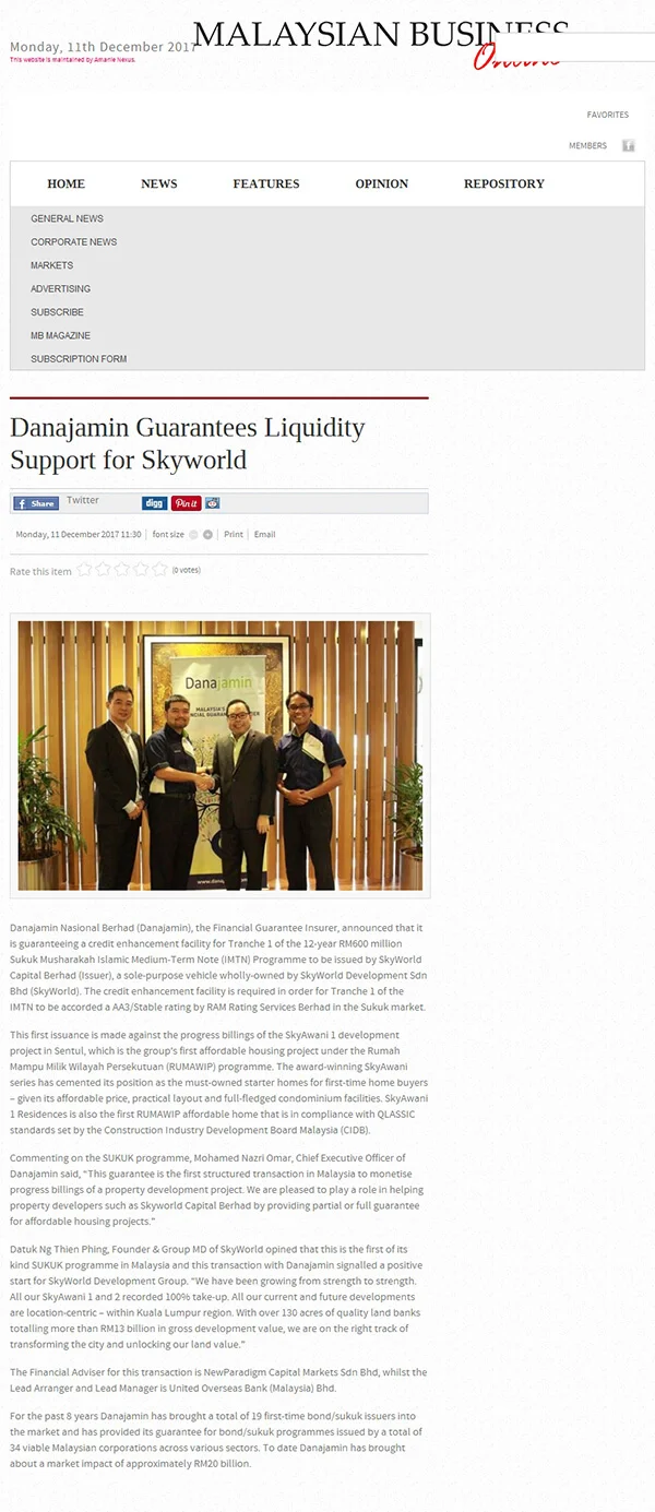 On 8 Dec 2017, Danajamin Nasional Berhad, the country’s first Financial Guarantee Insurer announced that it is guaranteeing a credit enhancement facility for Tranche 1 of the 12-year RM600 million Sukuk Musharakah Islamic Medium-Term Note (IMTN) Programme to be issued by SkyWorld Capital Berhad, a sole-purpose vehicle wholly-owned by SkyWorld Development Sdn Bhd. Datuk Ng Thien Phing, Founder & Group MD of SkyWorld opined that this is the first of its kind SUKUK programme in Malaysia and this transaction with Danajamin signalled a positive start for SkyWorld Development Group. “We have been growing from strength to strength. All our SkyAwani 1 and 2 recorded 100% take-up. All our current and future developments are location-centric – within Kuala Lumpur region. With over 130 acres of quality land banks totalling more than RM13 billion in gross development value, we are on the right track of transforming the city and unlocking our land value.