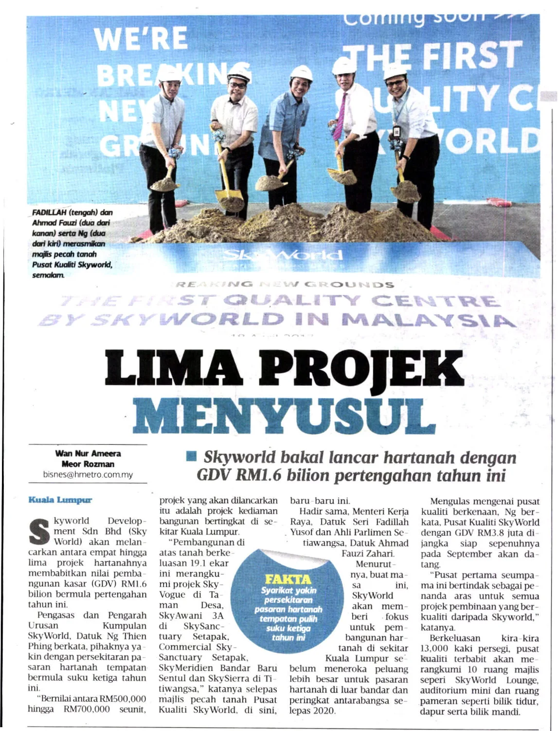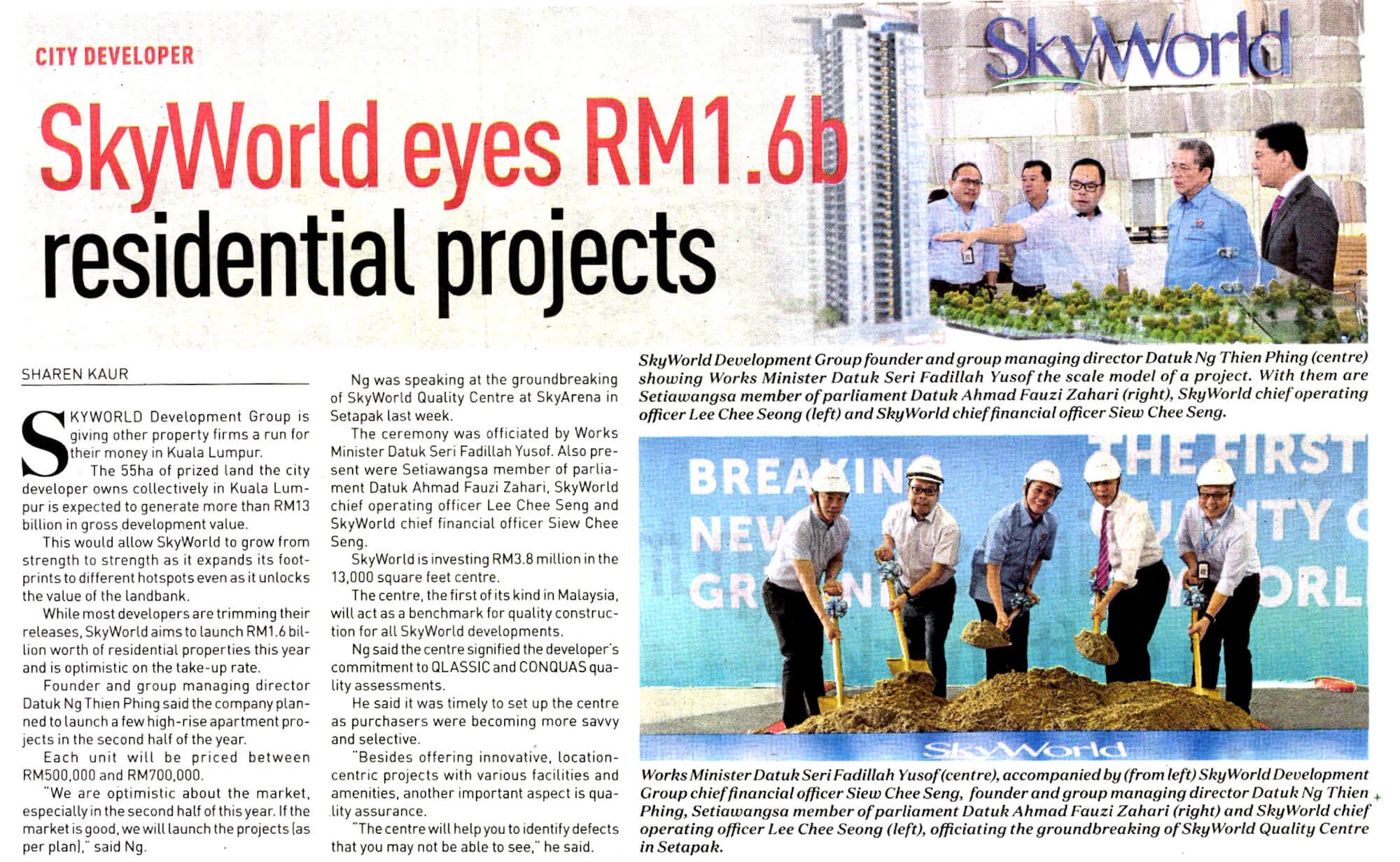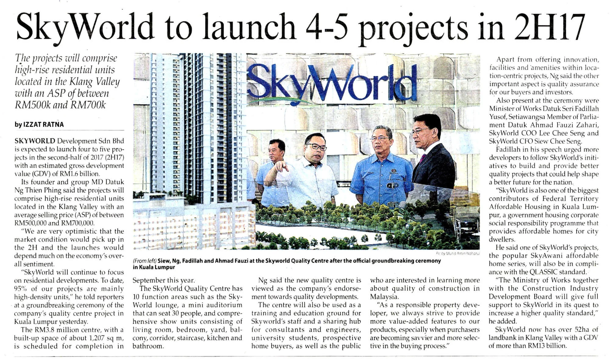 Also present to officiate the groundbreaking ceremony was YB Dato’ Ahmad Fauzi Bin Zahari, Ahli Parlimen Setiawangsa, Mr Lee Chee Seng, COO and Mr Siew Chee Seng, CFO of SkyWorld.