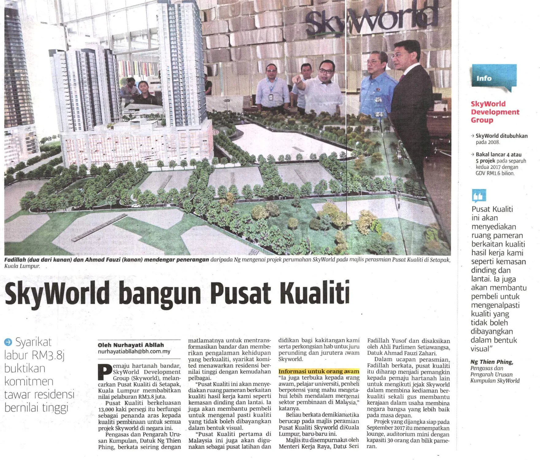 Present to grace and officiate the momentous event, Dato’ Sri Haji Fadillah, Minister of Works Malaysia said, “Indeed, SkyWorld is BREAKING NEW GROUNDS by kick-starting the FIRST Quality Centre by SkyWorld in Malaysia. I want to congratulate SkyWorld for embracing the professional quality practice and pledged their commitment by investing RM3.8 million into this 13,000 square feet Quality Centre. I encourage other developers to follow suit and help us in building a better nation and quality of life for our people.”