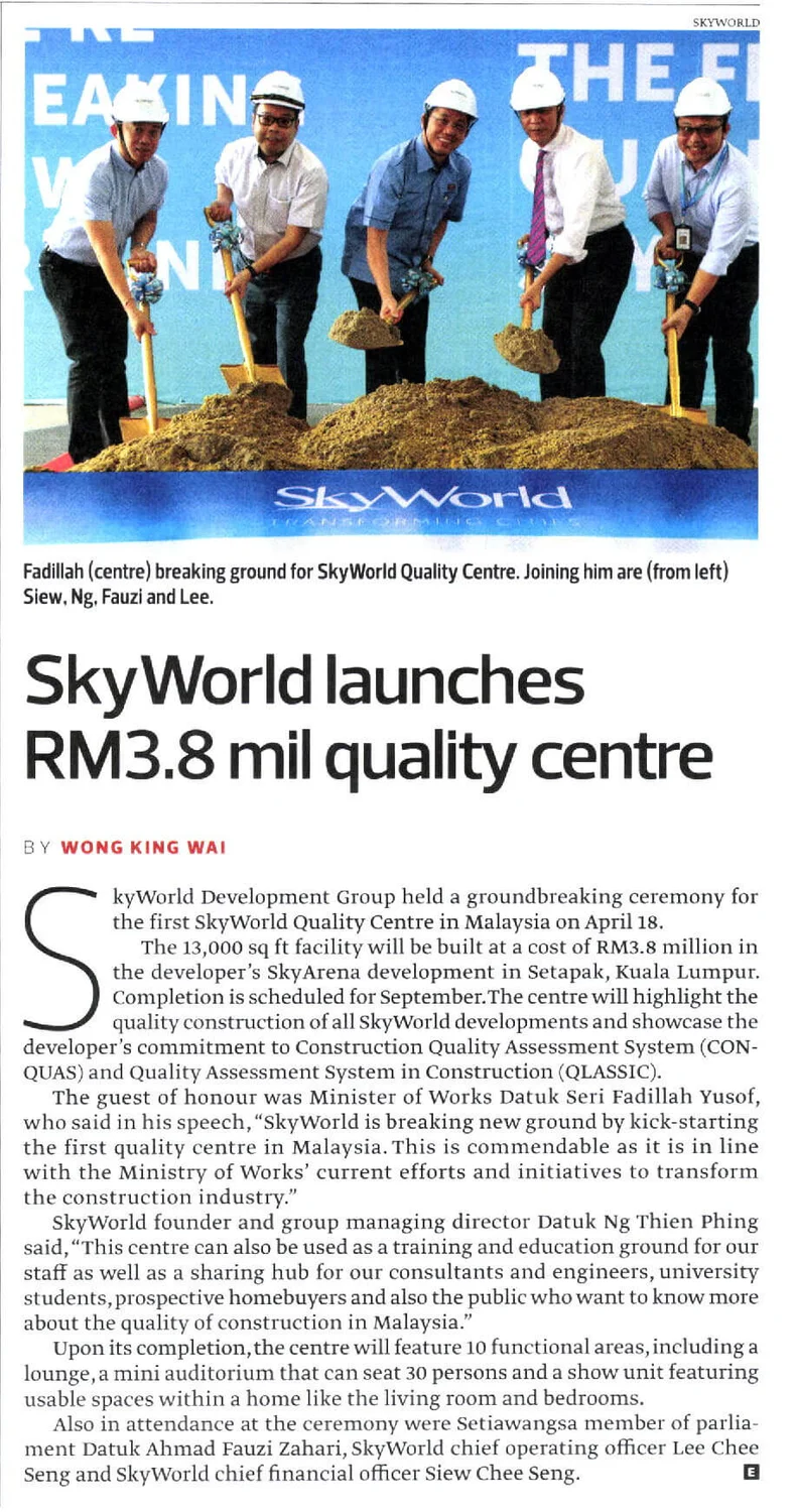 On 18 April 2017, SkyWorld indeed live up to its promise of delivering on its three strengths – value creation, innovation and Sky Living experience. Breaking new grounds at SkyArena Setapak, SkyWorld today announced the commencement of the FIRST Quality Centre by SkyWorld in Malaysia. The ground-breaking ceremony marked another important milestone for the emerging developer, as it grew from strength to strength and earned more vote of confidence as well as support from its purchasers and business associates.