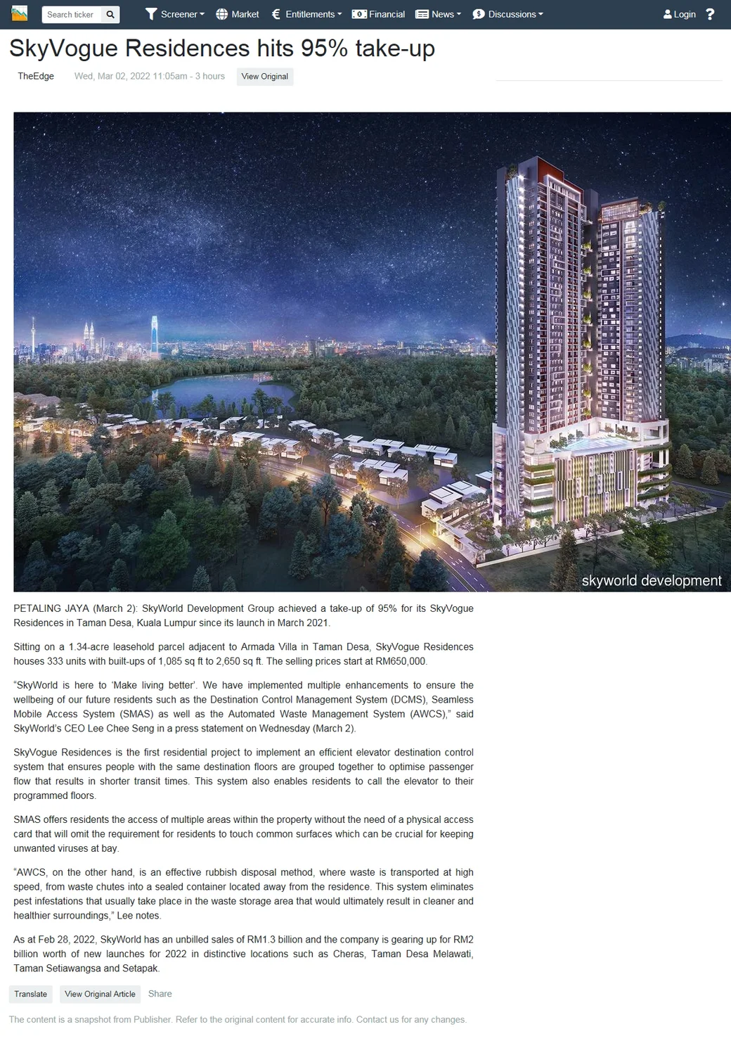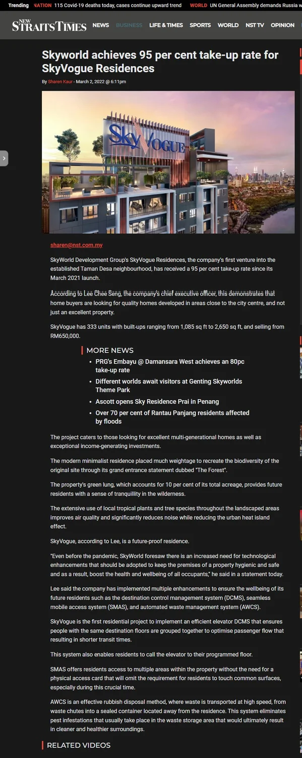 As at Feb 28, 2022, SkyWorld has an unbilled sales of RM1.3 billion and the company is gearing up for RM2 billion new launches for year 2022 in distinctive locations such as Cheras, Taman Desa Melawati, Taman Setiawangsa and Setapak.