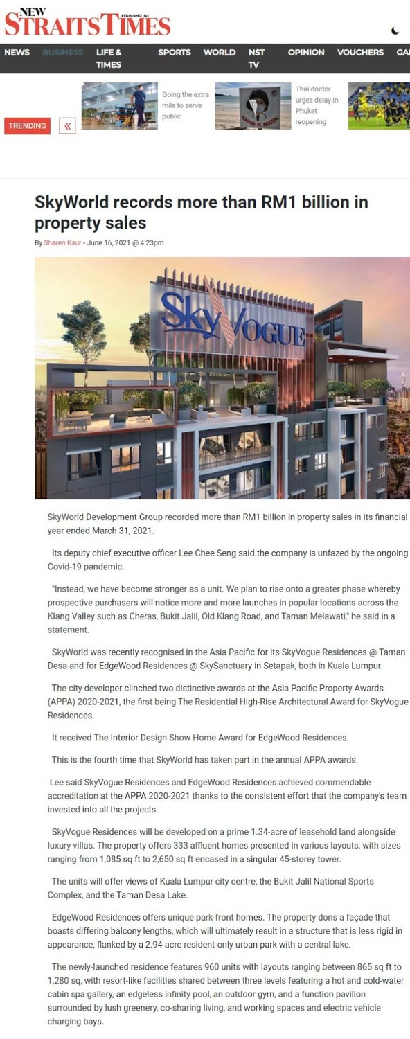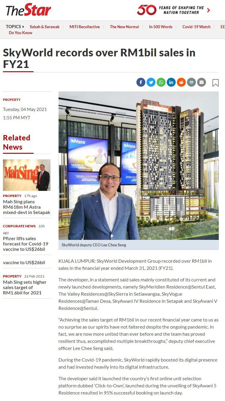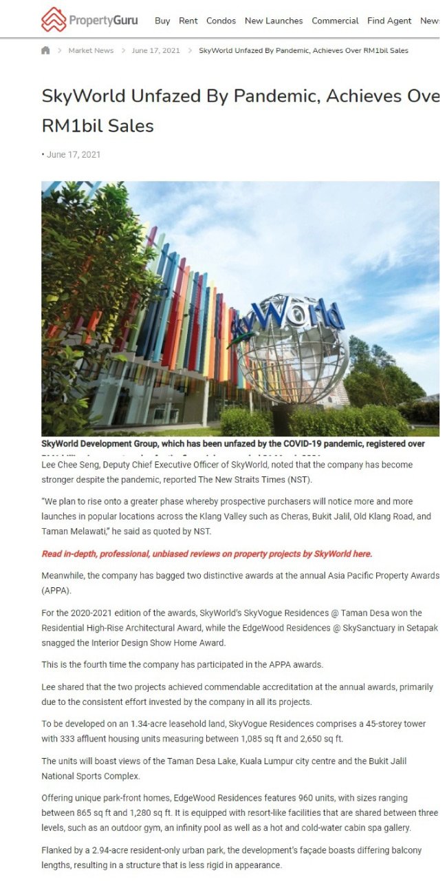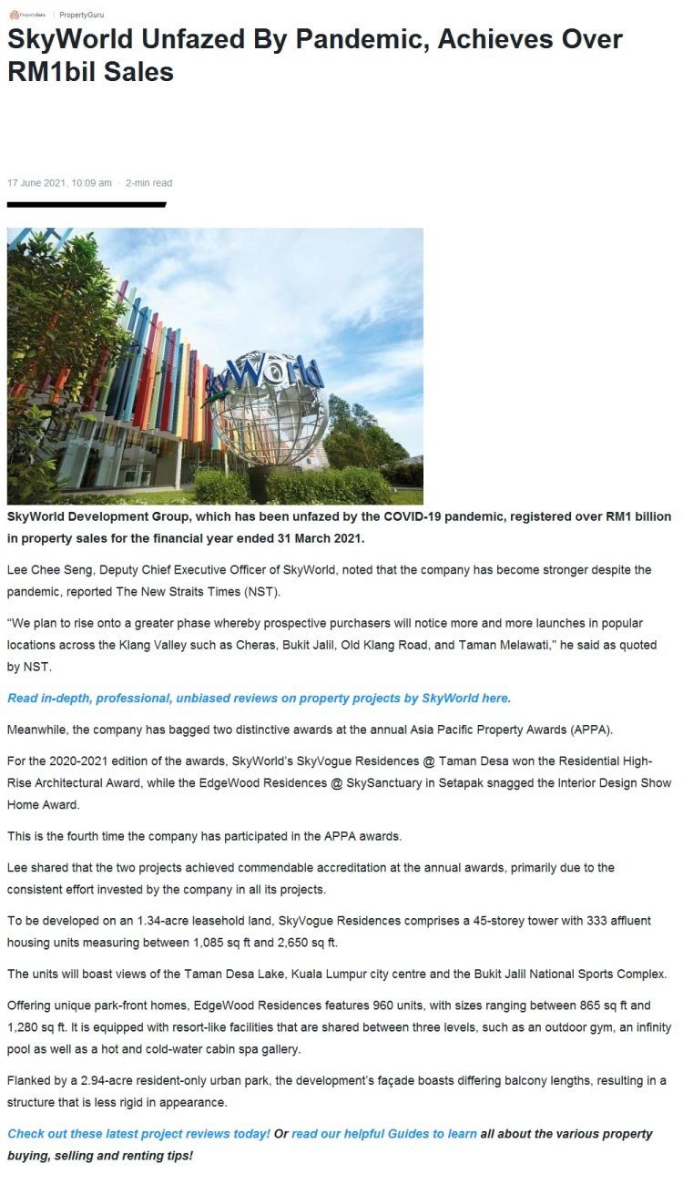 On 3 May 2021, SkyWorld had recorded over RM1bil in sales upon completing its financial year that had ended on the 31st of March 2021. 5 key developments poised as the key catalytic factor that had aided in the company’s ground-breaking milestone including SkyMeridien@Sentul East, The Valley Residences@SkySierra in Setiawangsa, SkyVogue Residences@Taman Desa, SkyAwani IV Residence in Setapak and SkyAwani V Residence@Sentul.