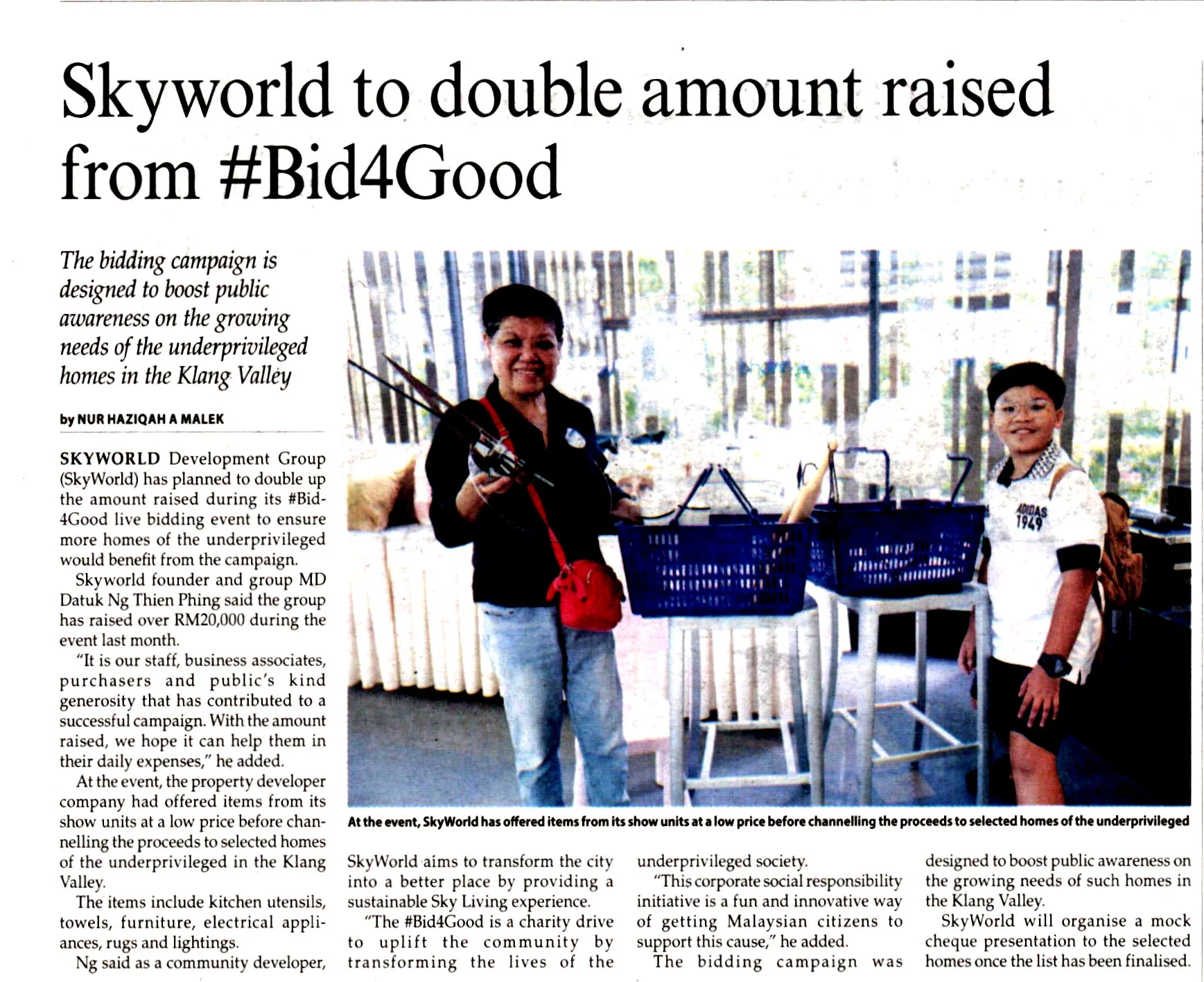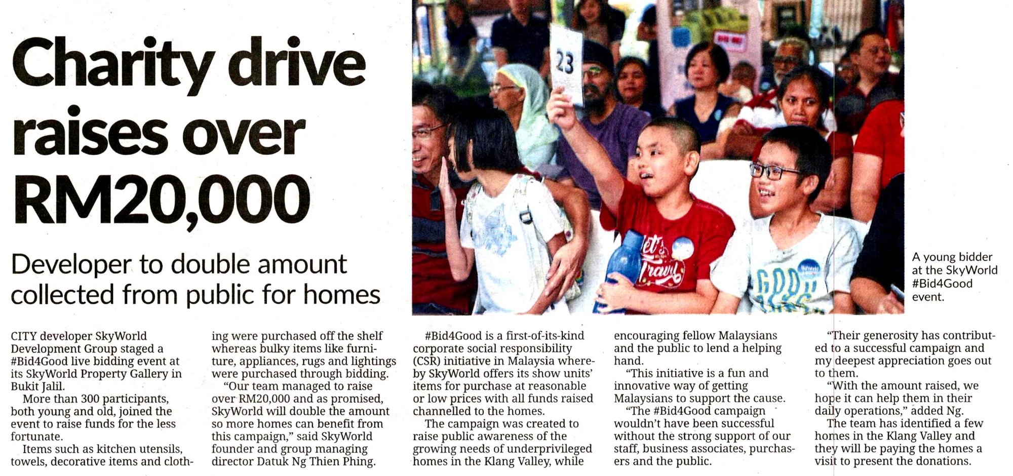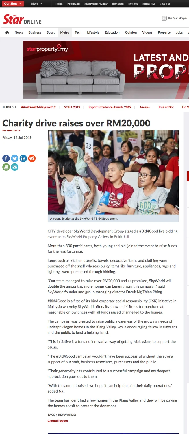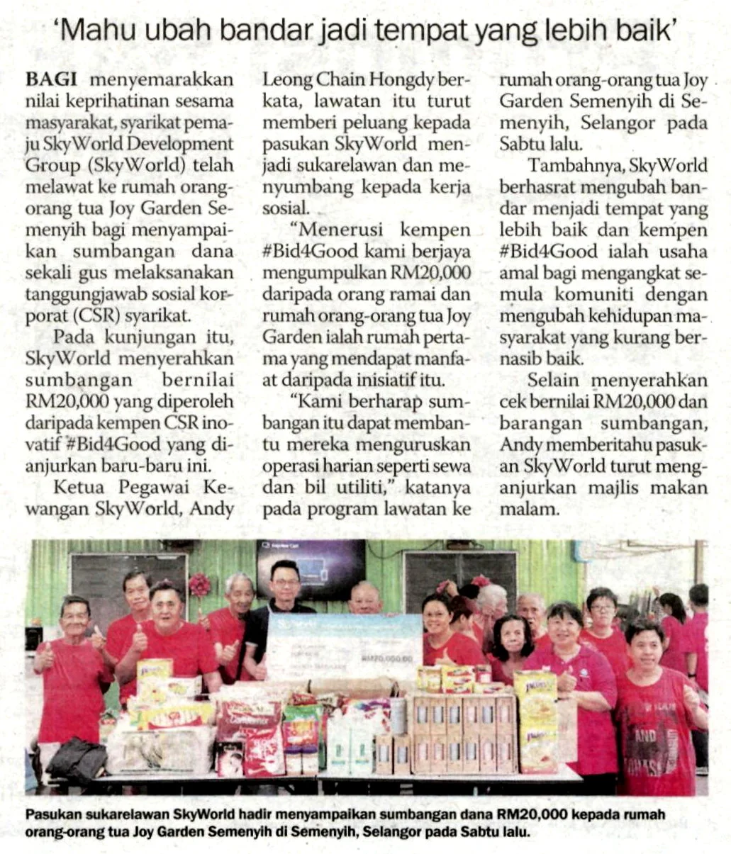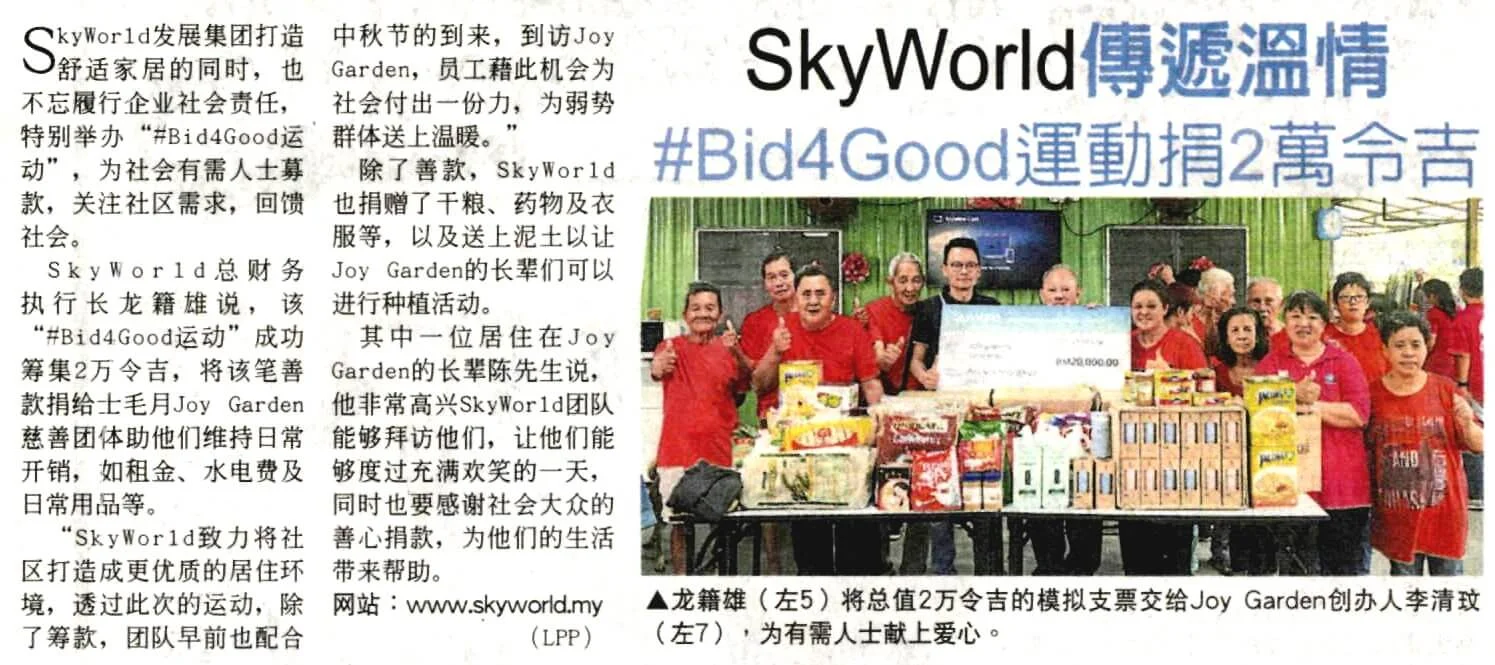 #Bid4Good is possibly the first of its kind CSR initiative in Malaysia where SkyWorld has offered its show units’ items for purchase at a reasonable or low price and all funds raised will be channeled to the homes. This campaign was created in hopes of boosting public awareness on the growing needs of underprivileged homes in the Klang Valley while encouraging fellow Malaysians and the public to lend a helping hand through a simple act of bidding. As a community developer, SkyWorld aims to transform the city to a better place by providing a sustainable Sky Living experience and #Bid4Good is a charity drive to uplift the community by transforming the lives of the underprivileged society.