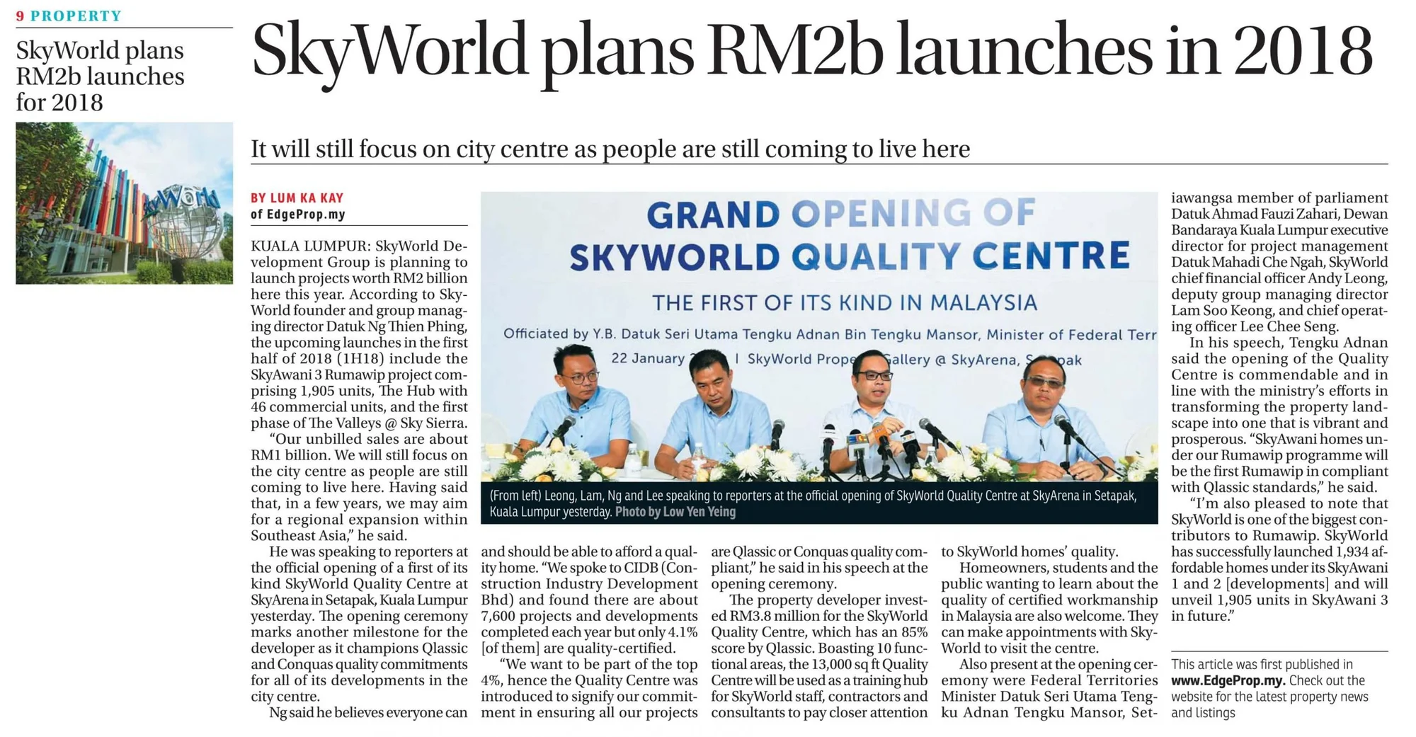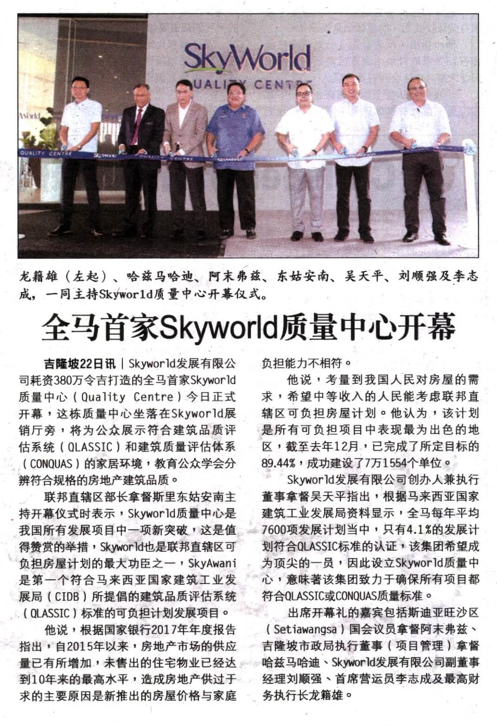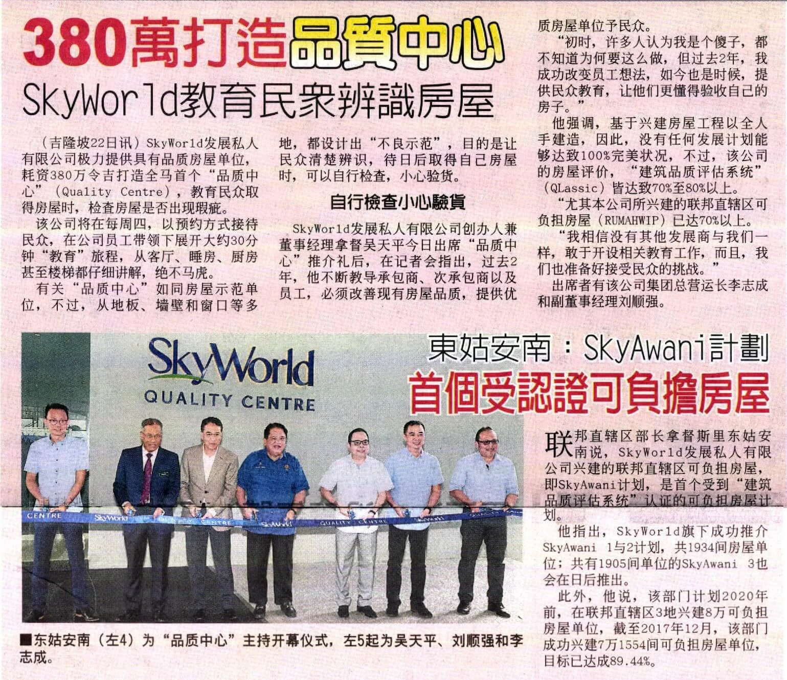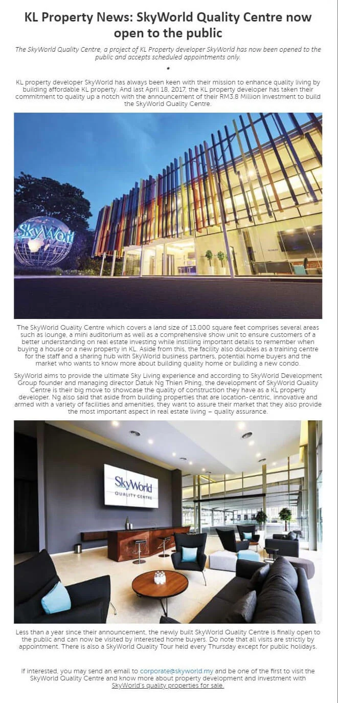 On 22 January 2018, SkyWorld finally unveiled the highly anticipated RM3.8 million SkyWorld Quality Centre, the first of its kind in Malaysia. The grand opening ceremony marked another important milestone for SkyWorld as it took the bold step of championing QLASSIC / CONQUAS quality commitments in all its developments in Kuala Lumpur. This event signified a new era in the property industry – cementing the SkyWorld Quality Centre as a quality benchmark in Malaysia. To visit the centre, kindly register at skyworld.my/skyworld-quality