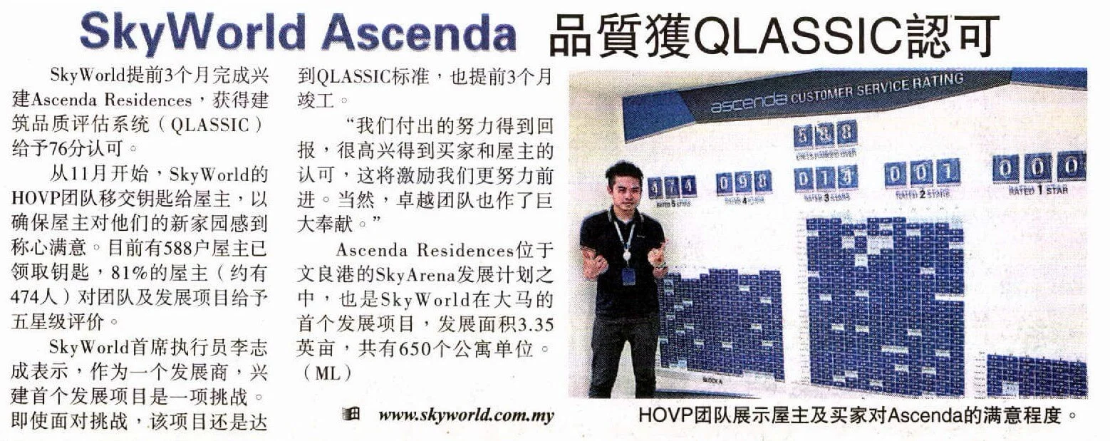 SkyWorld Development Group is closing the year on a high note. It’s latest completed development, Ascenda Residences at SkyArena, Setapak has completed 3 months ahead of schedule and received 76% QLASSIC quality score. It also saw proud and happy owners receiving their keys from November 2017. Since then, the dedicated project and hand over vacant possession team have worked tirelessly to ensure homeowners are pleased with their new homes. Their hard work paid off when 81% of its homeowners gave 5-star rating to the team and the project.