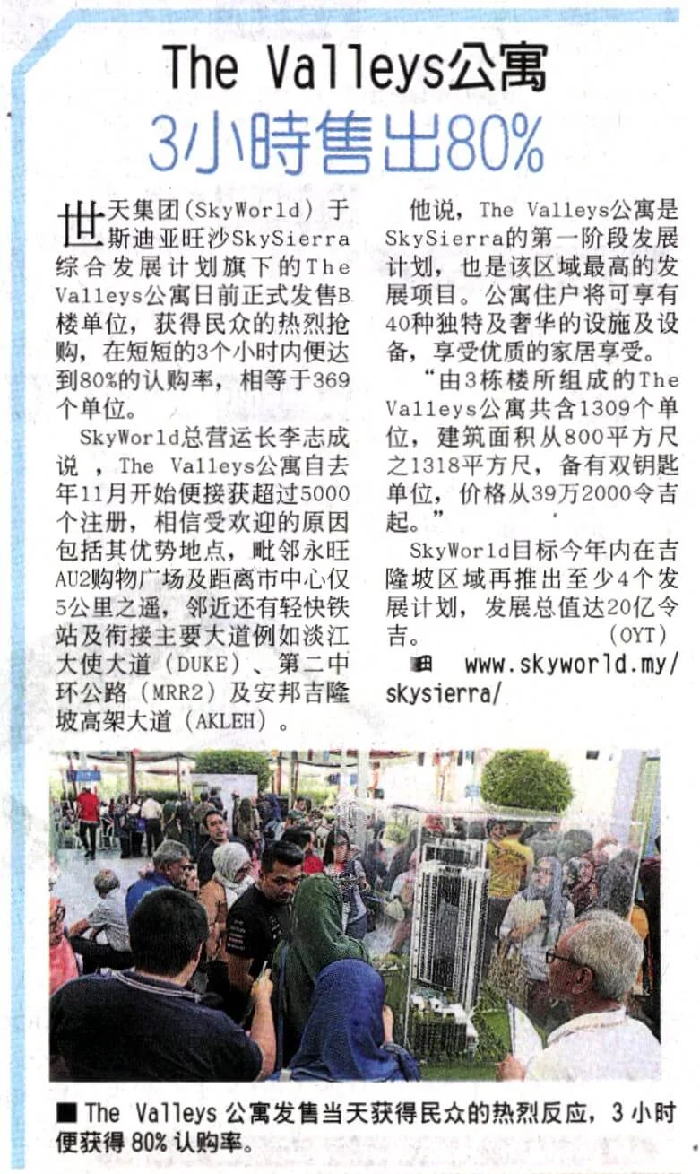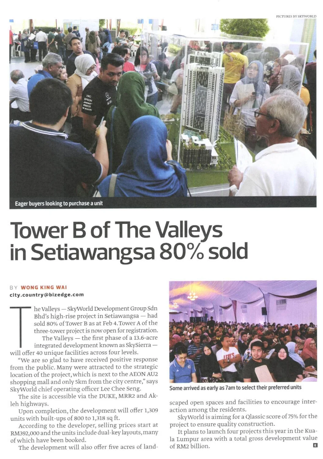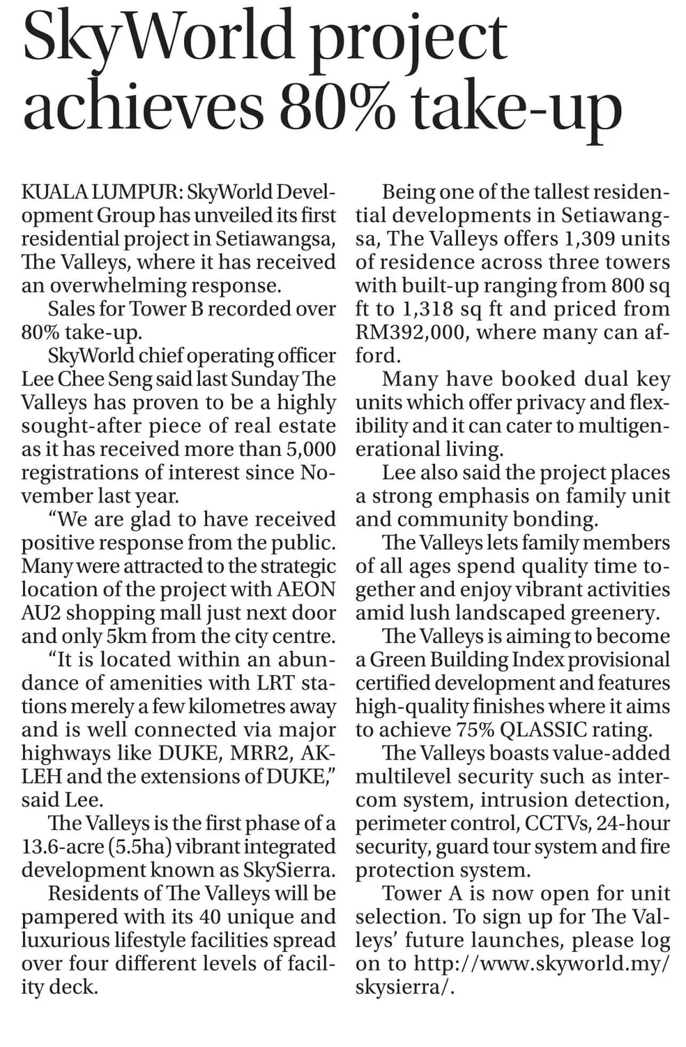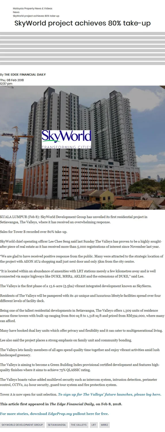 On 4 February 2018, SkyWorld unveiled its first residential project at Setiawangsa, ‘The Valleys’ where it has received an overwhelming response when it’s Tower B recorded over 80% take-up. Being one of the tallest residential development, The Valleys boasts 40 unique and luxurious lifestyle facilities. To sign up for The Valleys future launches, please log in to http://www.sw.skyworld.my/skysierra/
