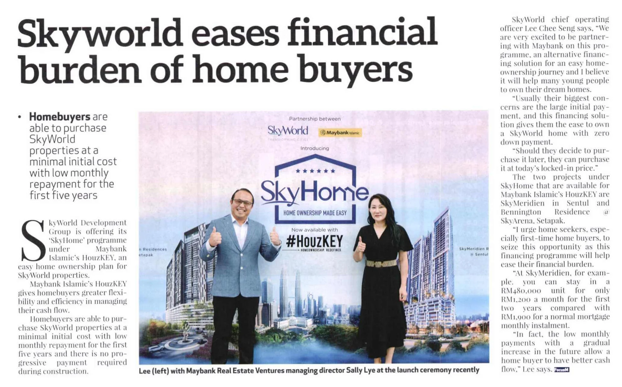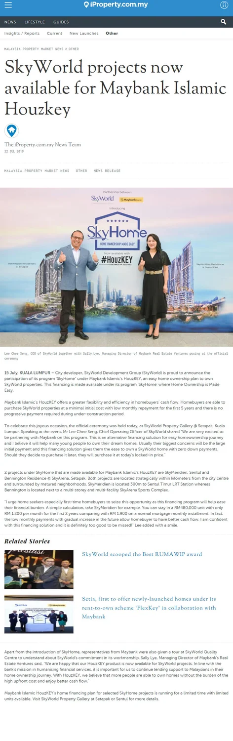 On 15 July 2019, SkyWorld Development Group is proud to announce the participation of its program ‘SkyHome” under Maybank Islamic’s HouzKEY, an easy home ownership plan to own SkyWorld properties. This financing is made available under its program ‘SkyHome’ where Home Ownership is Made Easy.