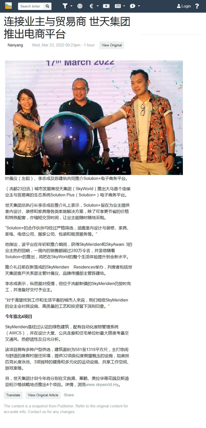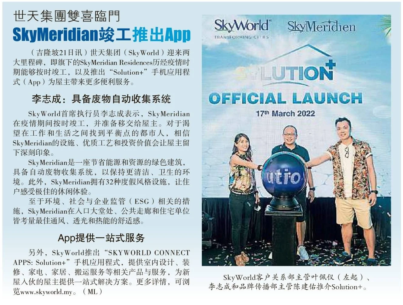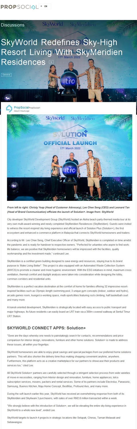 On 17 March 2022, City developer SkyWorld Development Group (SkyWorld) hosted an Aloha beach party themed media tour at its very own multi-award winning and newly completed SkyMeridien Residences (SkyMeridien). Guests were invited to witness themselves the resort- inspired sky living experience and official launch of Solution Plus (Solution+), the first ecosystem and enhanced e-commerce platform in Malaysia that connects SkyWorld homeowners and traders.