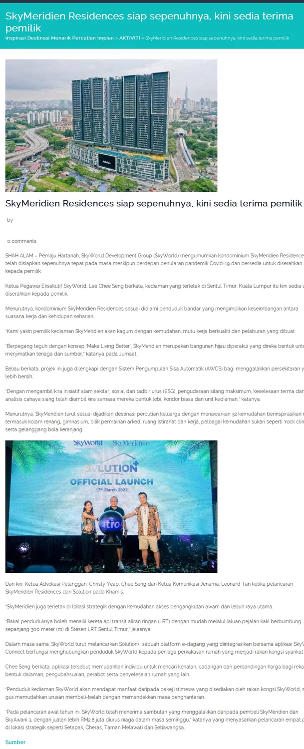 All SkyWorld Solution+ partners are carefully selected through a stringent selection process from wide varieties of move-in necessities, ranging from Interior design and renovation, furniture, home appliances, telco subscription services, movers, packers and rental services. Some of its partners include Electrolux, Panasonic, Samsung, Buenos Kitchen, Maju Home Concept, BestMas, Profound Axis, and many more. During the soft launch earlier this year, SkyWorld has received an overwhelming response from both of its SkyMeridien and SkyAwani 3 purchasers, with sales of over RM2.8 million transacted within a week. “We strongly believe with the introduction of Solution+, we will be elevating the entire sky-living experience in SkyWorld to a whole new level”, ended Lee. SkyWorld targets to launch 4 projects in strategic locations like Setapak, Cheras, Taman Melawati and Setiawangsa. Get the latest updates from SkyWorld via www.skyworld.my