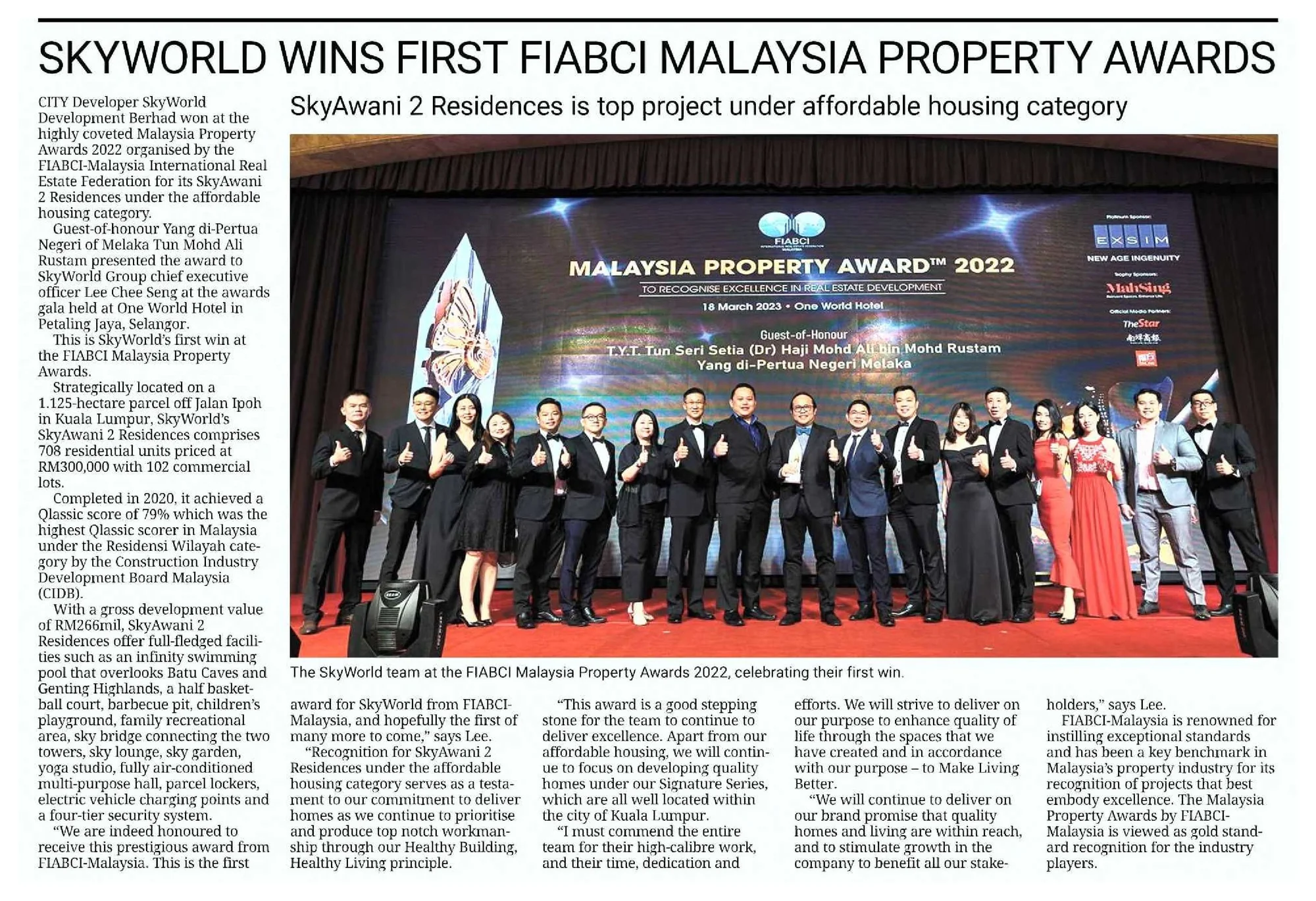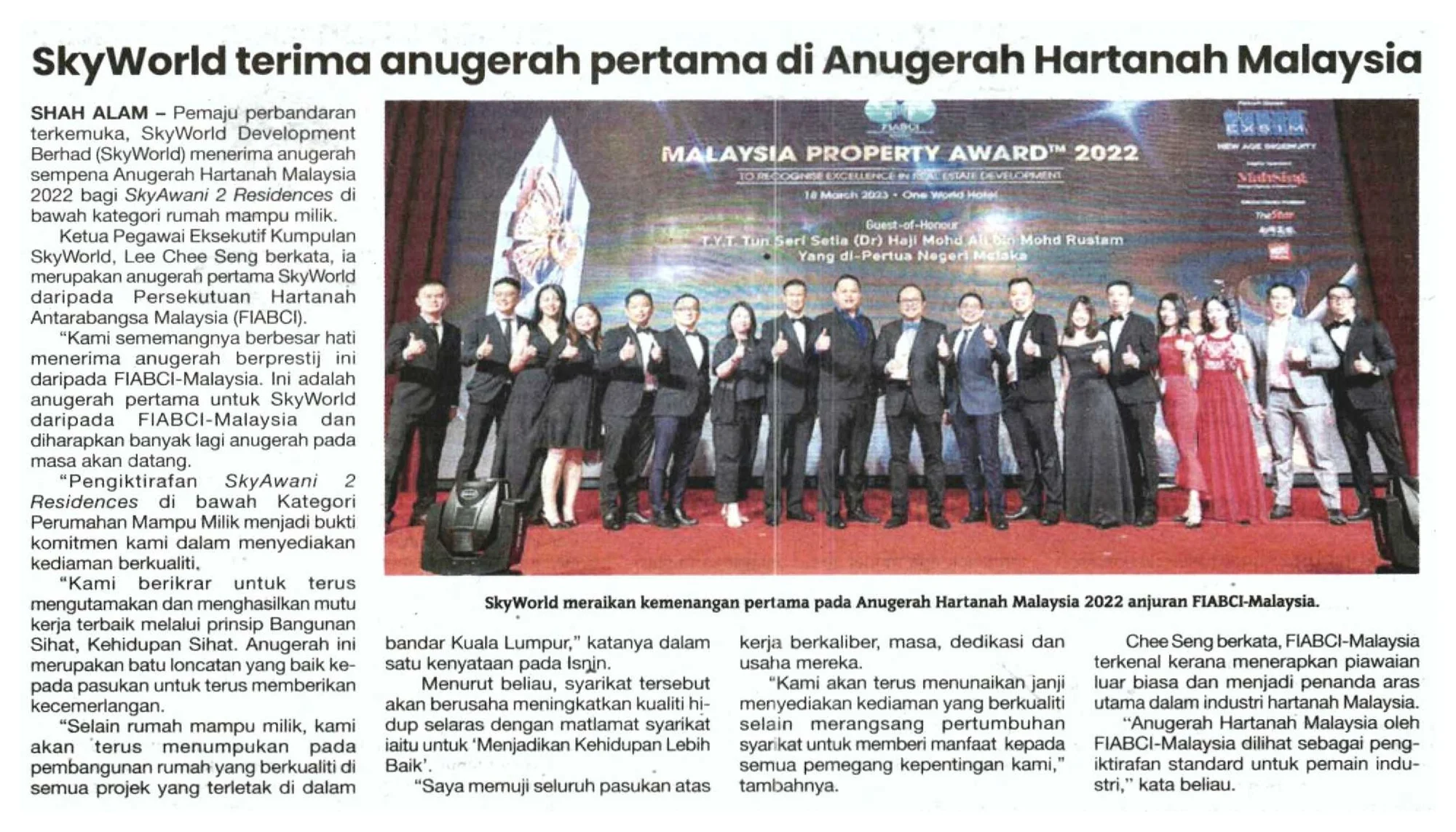 SkyWorld has received an award at the highly coveted Malaysia Property Awards 2022 from FIABCI-Malaysia International Real Estate Federation (FIABCI) for its SkyAwani 2 Residences under the affordable housing category (“Award”). The Award was conferred by TYT Tun Seri Setia (Dr.) Haji Mohd Ali bin Mohd Rustam, Governor of Malacca to SkyWorld Group’s Chief Executive Officer Mr. Lee Chee Seng at a ceremony held at One World Hotel, Bandar Utama. The Award is SkyWorld’s first at FIABCI’s Malaysia Property Awards.
