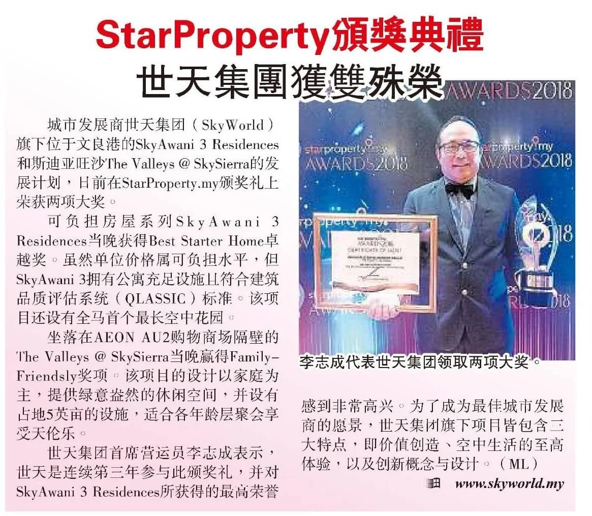 On 14 March 2018, SkyWorld bagged two prestigious awards at StarProperty.my Awards night held at JW Marriot, KL. Its affordable series ‘SkyAwani 3’ has won the Excellence award in The Best Starter Home category whereas The Valleys @ SkySierra, Setiawangsa won The Family-Friendly award. This will not happened without the support and hard work from both our team and consultants