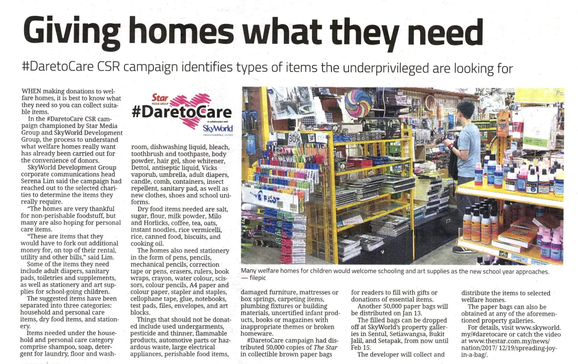 For those who wish to donate but did not receive the paper bag can bring along your donation items to any of our SkyWorld property galleries, request for the paper bag from our SkyWorld personnel, drop your donation items into the bag and hand it back to us. The bags can be dropped off at either one of the four SkyWorld property galleries from 18th December 2017 to 15th February 2018. For more details, check out www.skyworld.my/#DaretoCare
